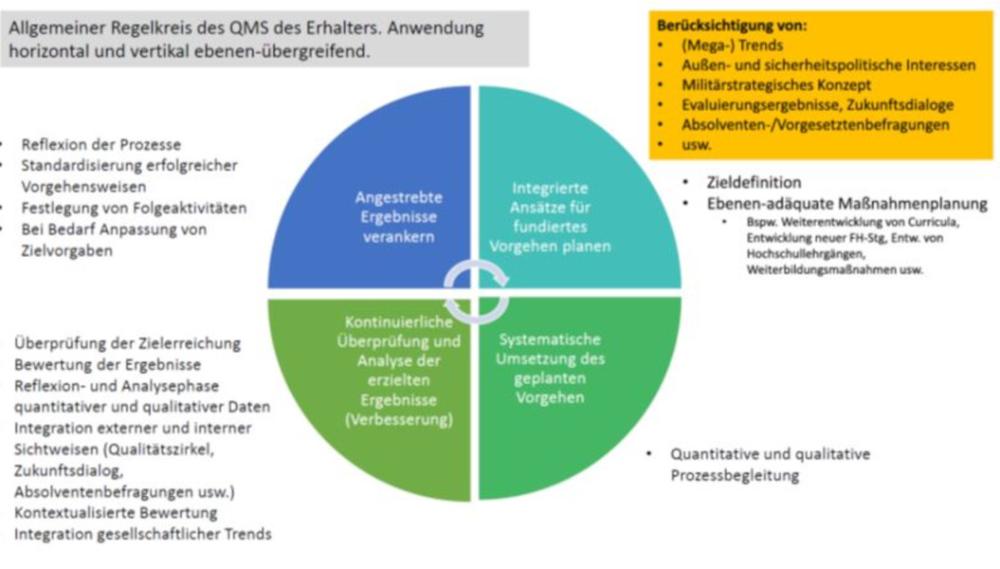 Durch die konsequente Anwendung und Weiterentwicklung des Qualitätsmanagementsystems des BMLV als Erhalter und die darin enthaltenen Festlegungen wird Bildungsqualität an der FH gewährleistet, die in dieser Form einzigartig ist.